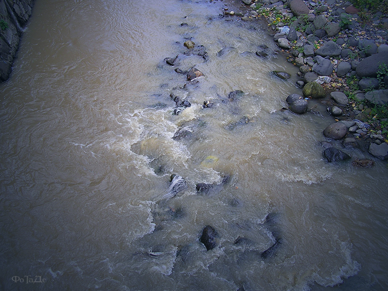 The main river in Georgia is the Kura river, whose basin is located on the territory of several countries and whose waters feed the Caspian Sea. It is the biggest river of Transcaucasus, its length is 1364 km. The Georgian name of the river is Mtkvari, which means "good water", but apparently this is a very ancient name, because the centuries of human existence around it (especially the XX century) have done their dirty work: the waters of the Kura are muddy and seem lifeless. Especially due to dump household waste into the river in some settlements (the river is actually used as a liquid dump). In this connection, the river is unsuitable not only as a source of drinking water, but even swimming in it is quite risky — you never know what fragments and garbage are lying on the bottom. Here I present photos of the Kura in the Borjomi gorge, taken in the fall of 2005. Surrounded by high cliffs, which overgrown with dense Caucasian forest, the river, as if justifying one of its names, breaks through the rocky landscape, confidently finding its way to the sea. Maybe, a human can ruin her appearance. But it's pointless to fight the elements. Despite the lack of respect for these waters, the Kura proudly carries its waters from Turkey to Azerbaijan, regardless of human weaknesses and vices. Anyway, people need this river more than river needs us. And not only because water is life. Actually, it is a very picturesque place.