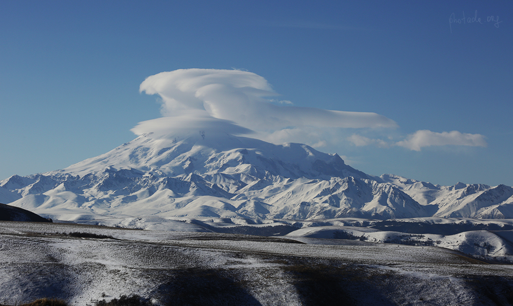 You can find below two pools of photos taken on different days of April 2015, during my vacation in Kislovodsk (a vacation in Kislovodsk is good because you have a great opportunity to travel around all the surroundings). The first pool of photos was taken on the road from Kislovodsk to Dombay, on the Gum-Bashi pass. On that way, we stopped at an observation deck near the settlement Verkhnyaya Mara, where we saw Elbrus in all its glory surrounded by snow-white hills. It is hard to believe, but between this site, located at an altitude of just over 2000 m above sea level, and the cavity between two peaks of Elbrus, about 50 km. It seems that here it is, very close... especially when you look at it on telephoto lens. But this is one of points on our planet that easily distort the impression about space. When we were driving to Dombay, the top of Elbrus was hidden by a huge lenticular cloud. But on the way back, the cloud disappeared, and we saw Elbrus in profile from north to south. Huge, calm... It's hard to believe that this is a dormant volcano...