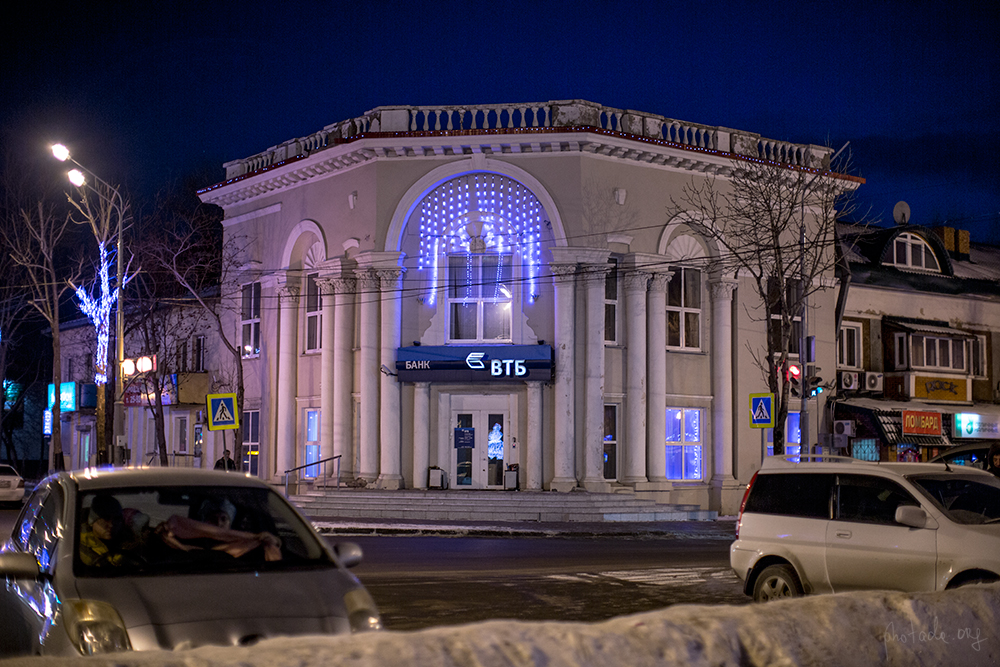 Здания и строения ночного Южно-Сахалинска, сфотографированные в январе 2017-го года. Здесь представлено несколько знаковых для различных аспектов городской жизни образцов.